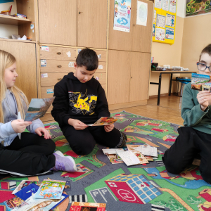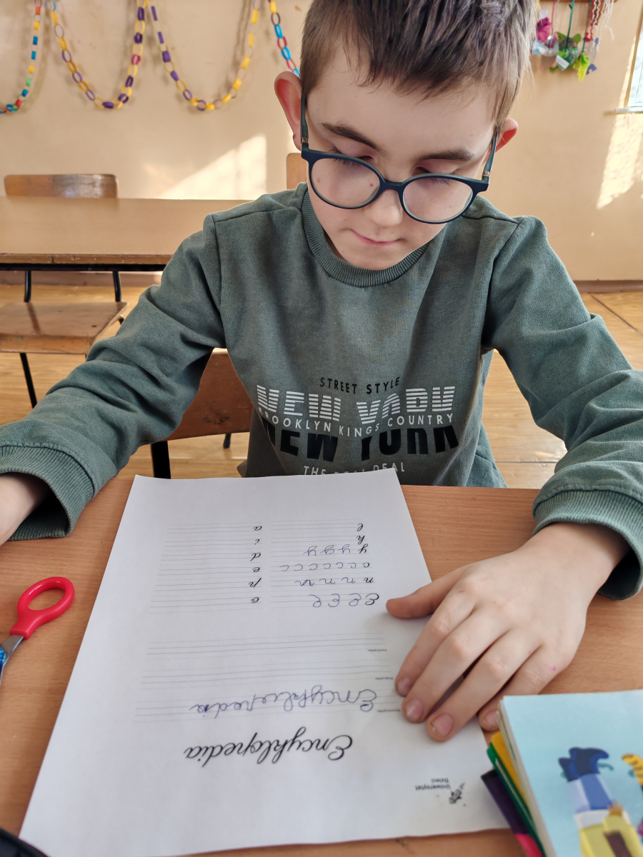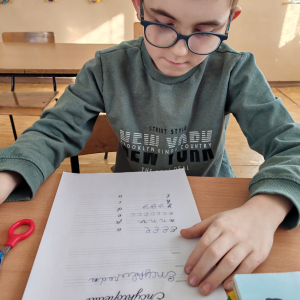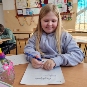 Podczas zajęć w klasie III dzieci rozmawiały o tym, dlaczego umiejętność pisania jest ważna w codziennym życiu oraz jak wyglądała korespondencja dawniej. Oglądały stare pocztówki, zwracając uwagę na charakter pisma, styl języka i sposób przekazywania informacji przed erą telefonów i internetu. Następnie ćwiczyły pisanie kaligraficzne, starając się estetycznie i starannie formować litery. Na zakończenie obejrzały prezentację podsumowującą historię pisma i jego znaczenie we współczesnym świecie.