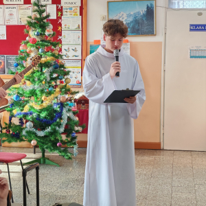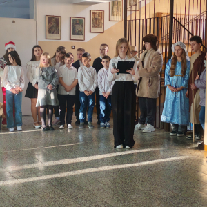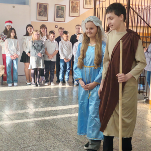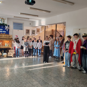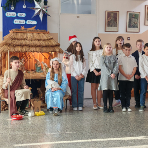 W przedświątecznych dniach w naszej szkole zapanowała wyjątkowa, pełna ciepła atmosfera. Jednym z najważniejszych wydarzeń tego okresu były szkolne jasełka, przygotowane przez ks. Pawła i p. Ewę Mróz, które w piękny i wzruszający sposób przypomniały historię narodzin Jezusa. Uczniowie z dużym zaangażowaniem wcielili się w swoje role, prezentując bożonarodzeniowe przedstawienie pełne symboliki i emocji.