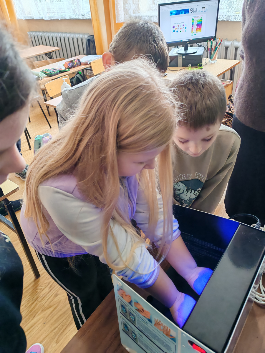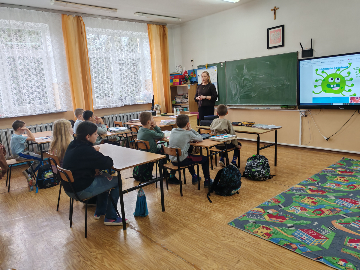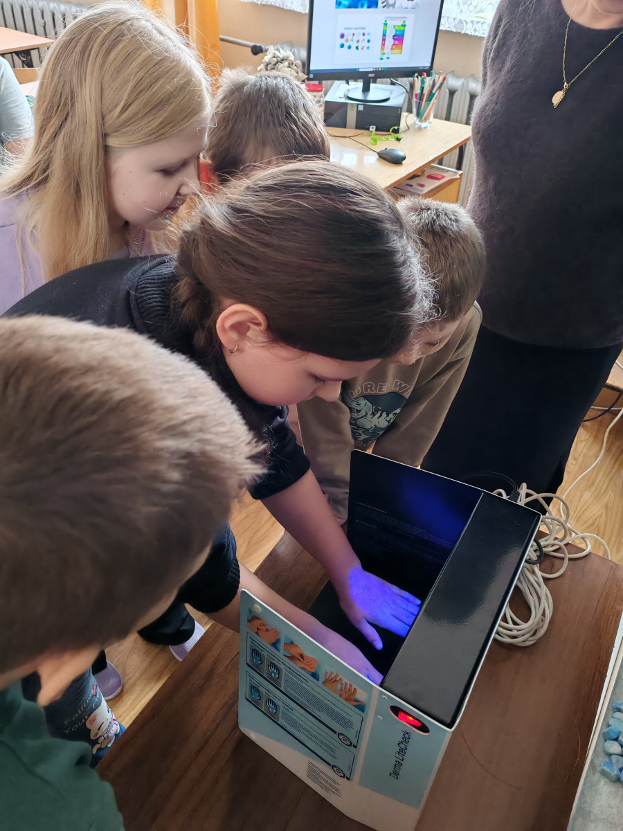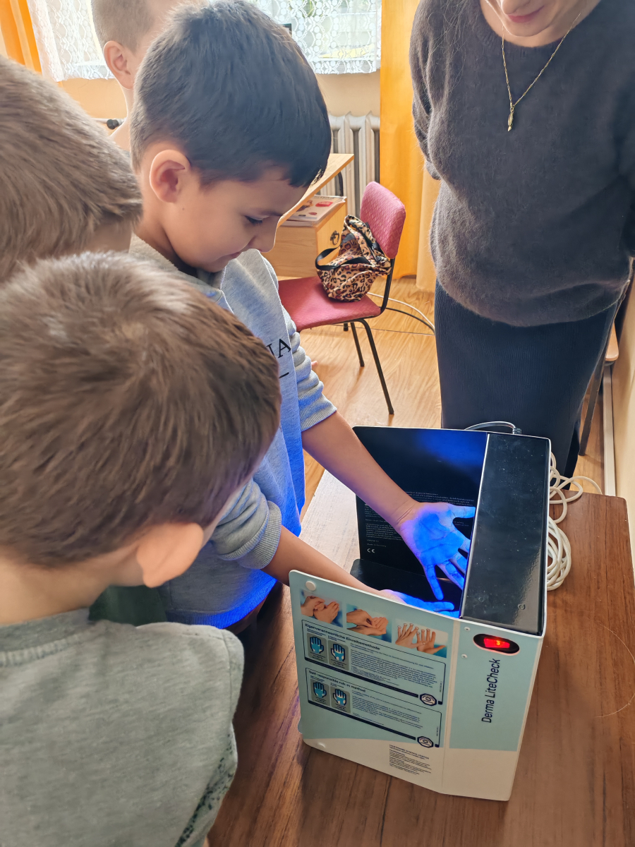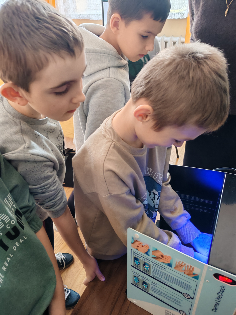 Najmłodsi uczniowie uczestniczyli w praktycznej lekcji poświęconej zasadom prawidłowej higieny. Dzieci poznały najważniejsze zasady dbania o zdrowie, ze szczególnym uwzględnieniem mycia rąk. Podczas zajęć wykorzystano szkoleniową lampę UV, dzięki której uczniowie mogli zobaczyć, czy ich ręce są naprawdę czyste. Eksperyment wzbudził duże zainteresowanie i uświadomił, jak ważna jest dokładność w codziennej higienie.