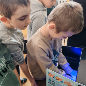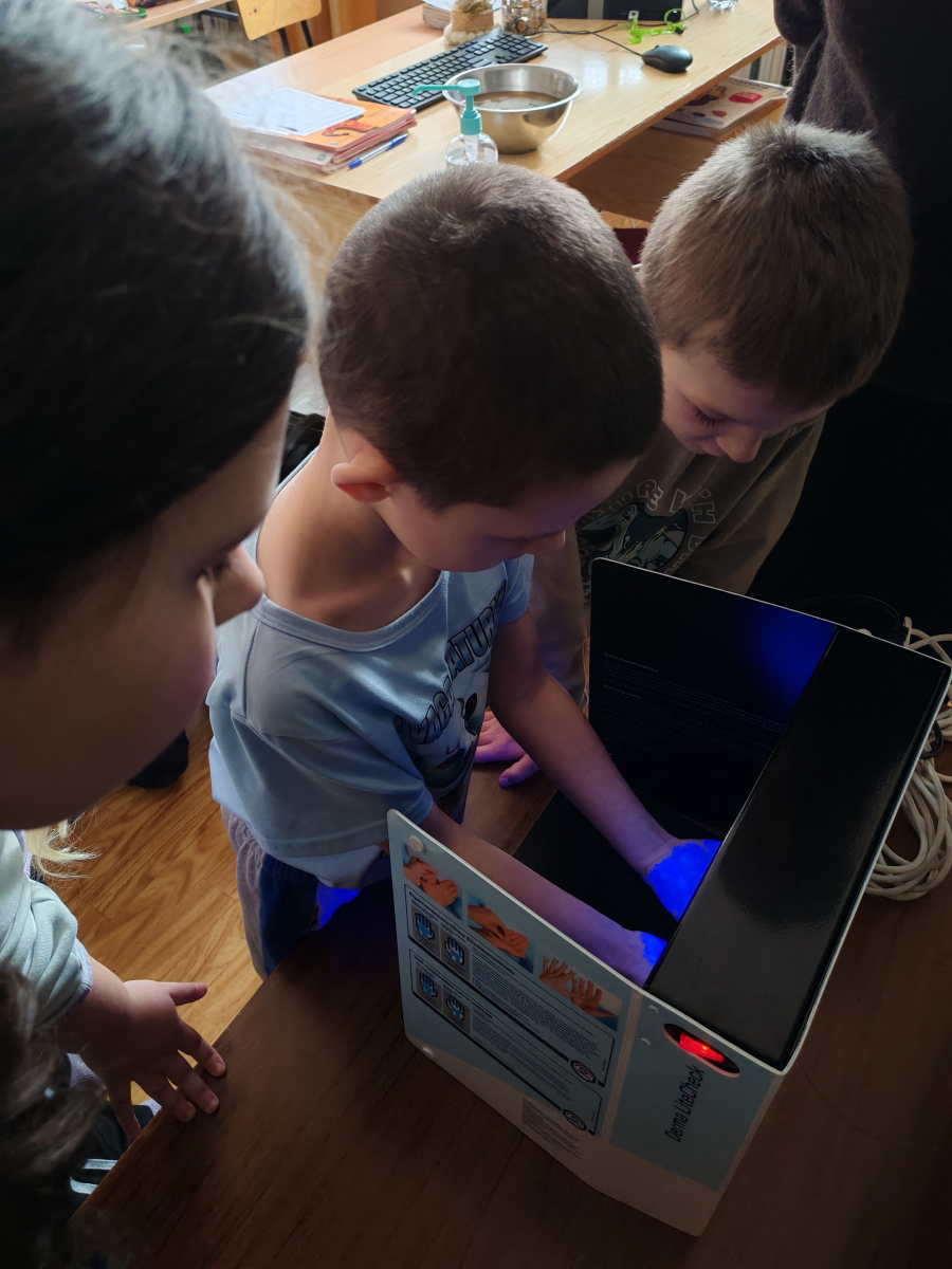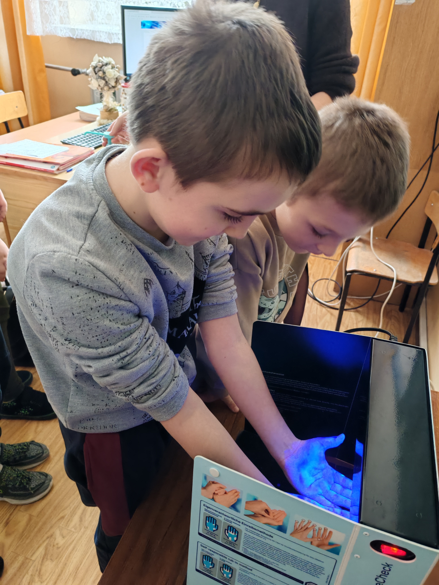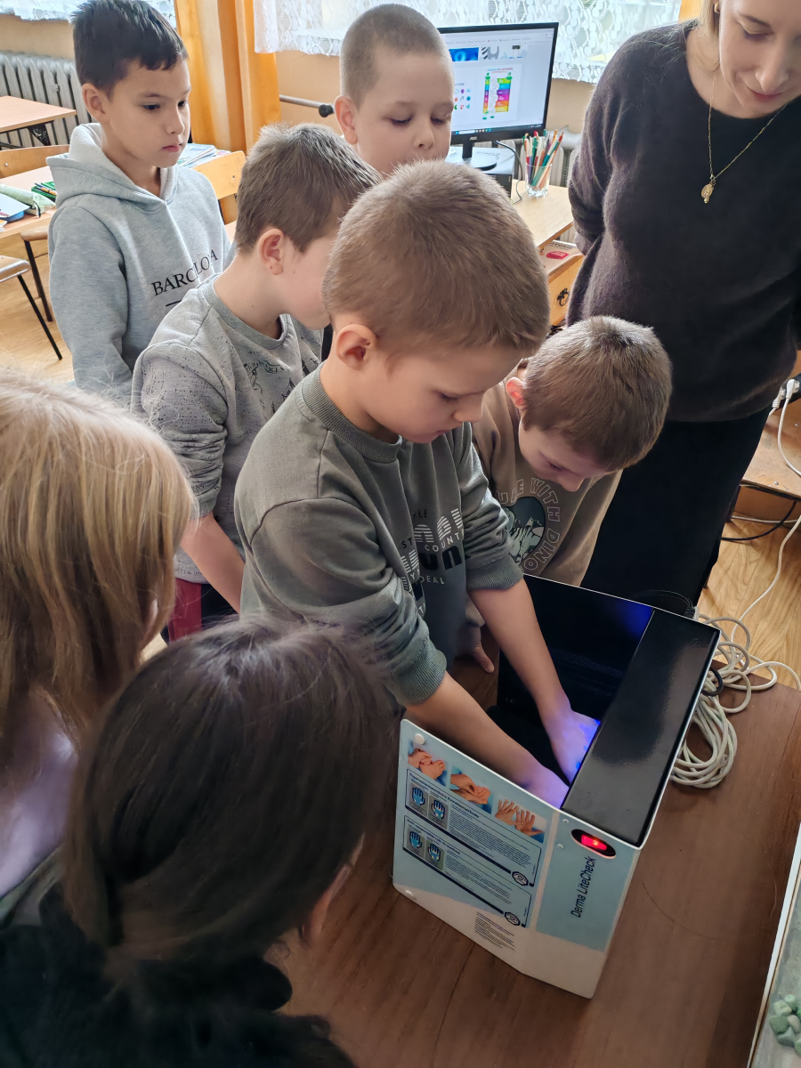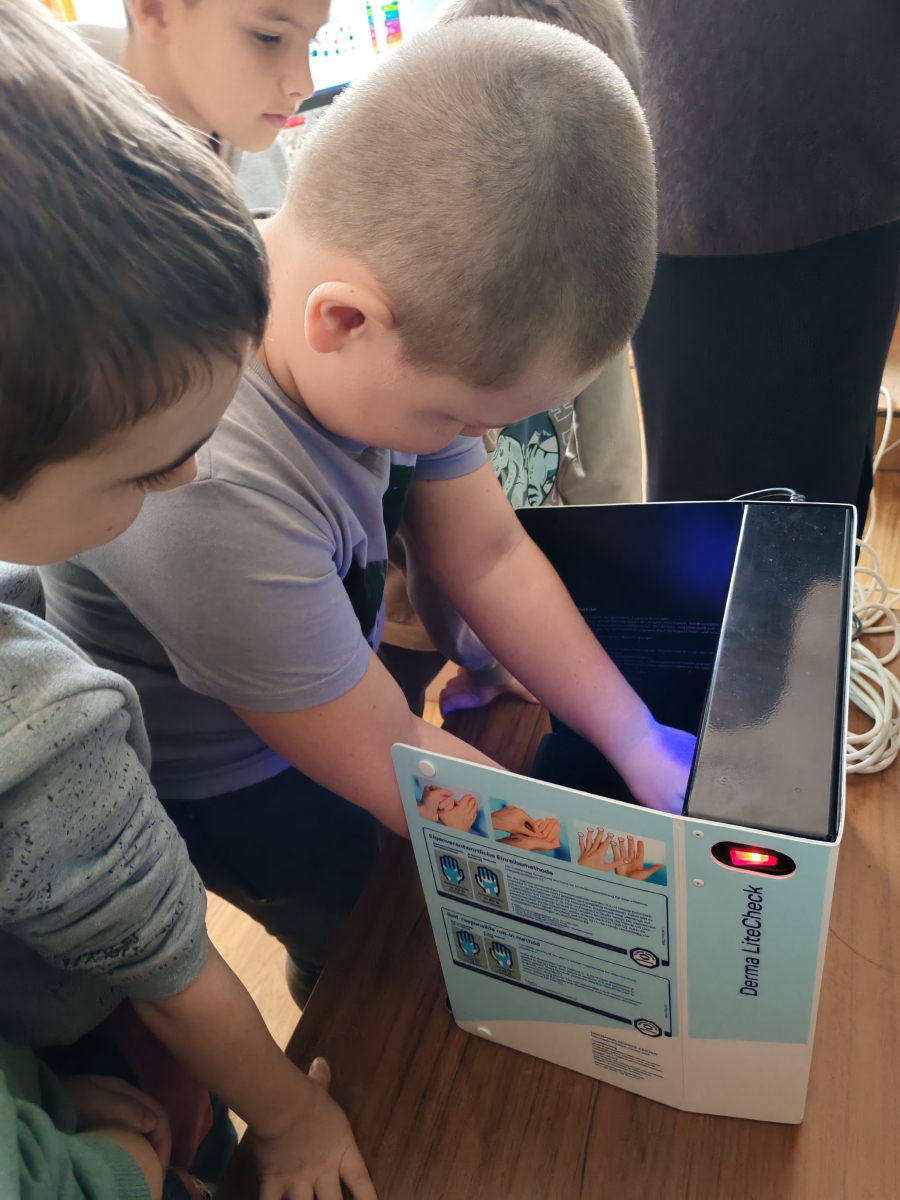 Najmłodsi uczniowie uczestniczyli w praktycznej lekcji poświęconej zasadom prawidłowej higieny. Dzieci poznały najważniejsze zasady dbania o zdrowie, ze szczególnym uwzględnieniem mycia rąk. Podczas zajęć wykorzystano szkoleniową lampę UV, dzięki której uczniowie mogli zobaczyć, czy ich ręce są naprawdę czyste. Eksperyment wzbudził duże zainteresowanie i uświadomił, jak ważna jest dokładność w codziennej higienie.
