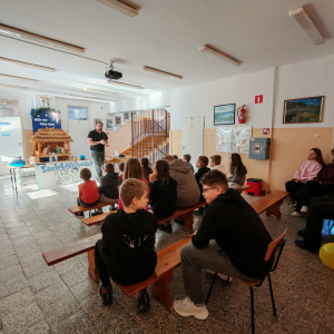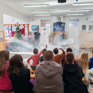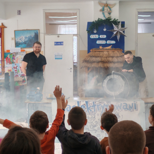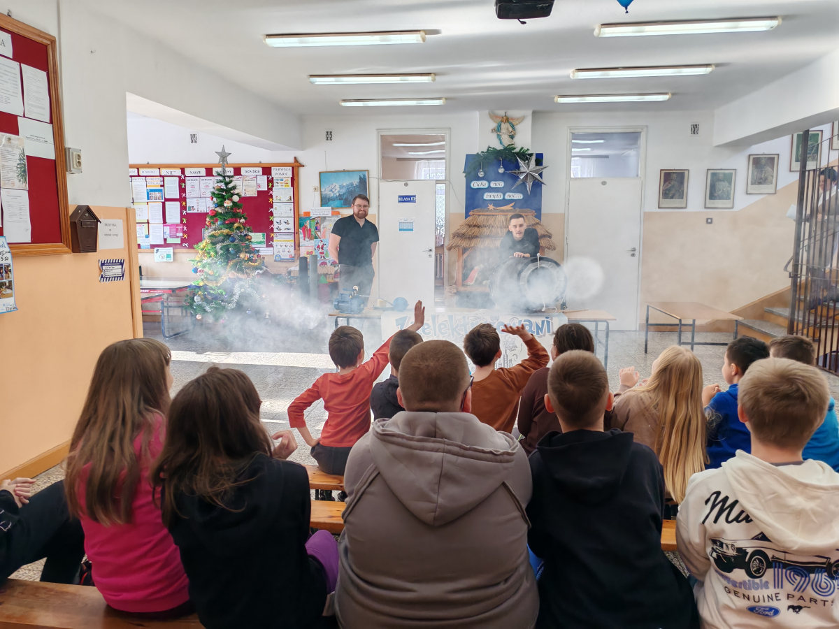 Prowadzący w przystępny i humorystyczny sposób wyjaśniali zjawiska fizyczne i chemiczne, zachęcając dzieci do zadawania pytań oraz wspólnego odkrywania świata nauki. Uczniowie z dużym zaangażowaniem brali udział w eksperymentach, reagując z entuzjazmem i ciekawością.